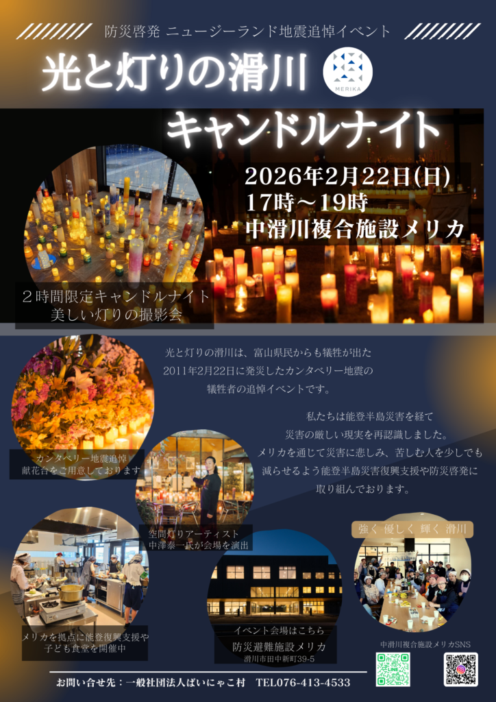 能登半島地震のチャリティーも合わせて、中滑川複合施設メリカでも滑川市の夜を美しく彩り故人を偲ぶ機会としたいと思います。お近くの方は、ぜひご来場ください。