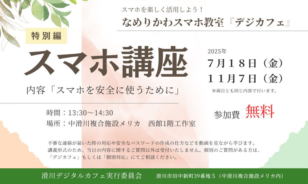 メリカにて開催のなめりかわスマホ教室「デジカフェ」から、特別編として参加費無料のスマホ講座を開催!