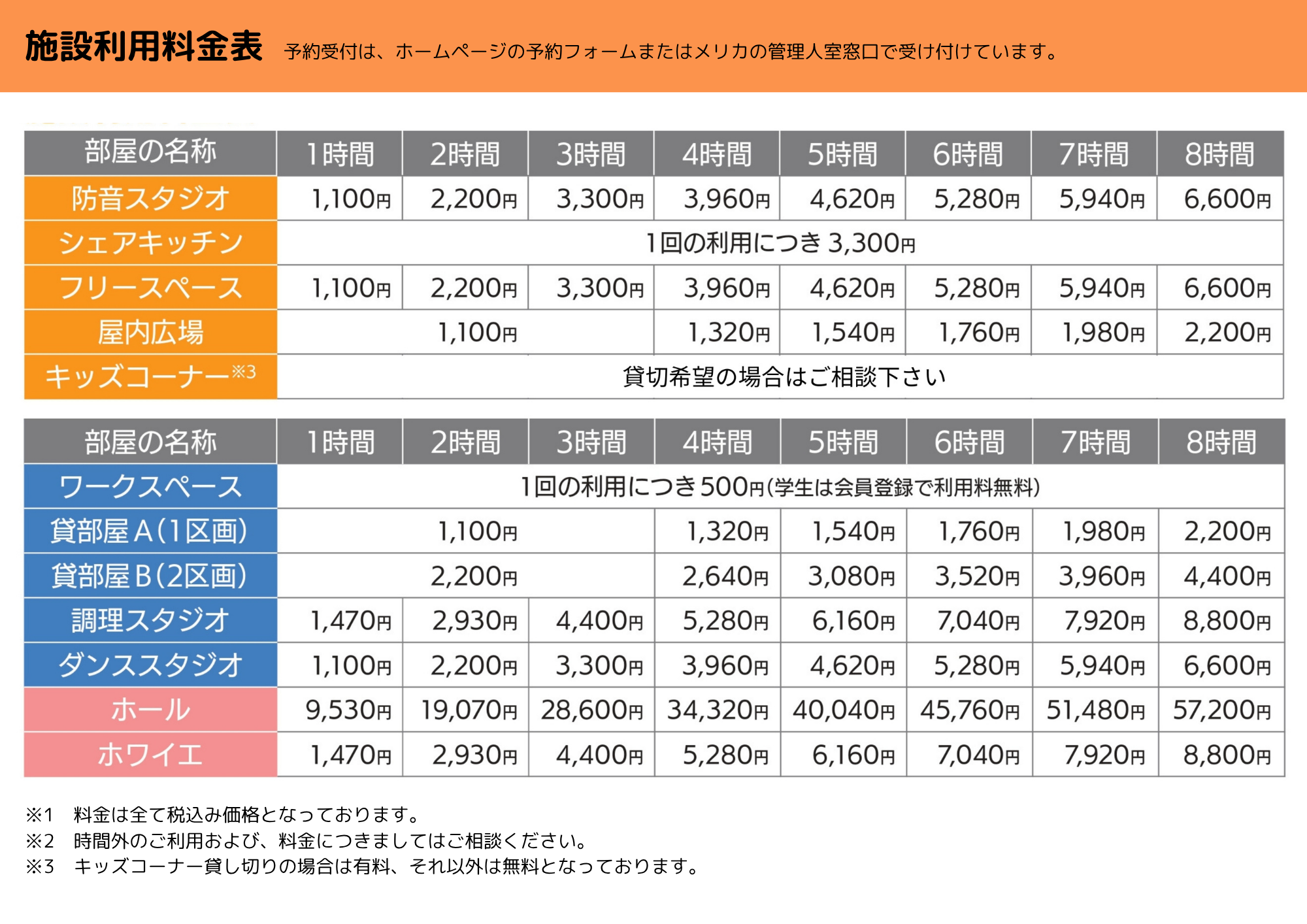 施設利用料金表(開館時間午前10時~午後6時まで)